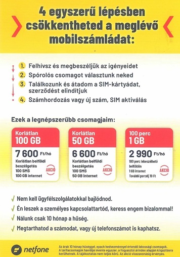 A High Ware Bt.(Pálfi Róbert személyében) a Netfone Telecom egyik képviselőjeként indíthatom a mobiltelefon Előfizetői Szerződés megkötését egyéni és céges előfizetők számára (számhordozással vagy új számmal). A csomagstruktúra egyszerű: Korlátlan belföldi beszélgetés / 500 perc lebeszélhető belföldön /100 perc lebeszélhető belföldön, illetve a csomagokban bennefoglalt internet 1GB /4GB / 20GB / 50 GB / 100GB választható. Sikeres szerződéskötés esetén én leszek a személyes kapcsolattartód.